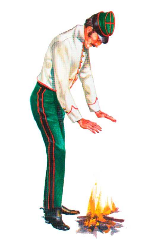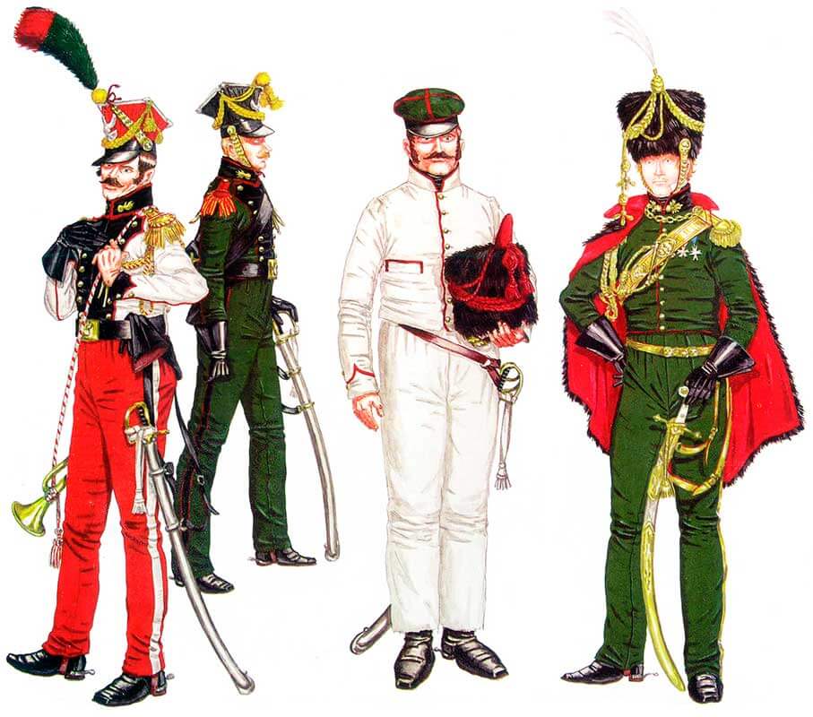 Поверх коротких сапог со стальными шпорами одевались длинные кавалерийские рейтузы из темно-зеленого сукна с двойными черными (по Линару-Умберу — красными) лампасами шириной 2 дюйма, отделанными по внешним краям красной тесьмой (от колена до лодыжки брюки застегивались на семь крючков и одну пуговицу из бархата).