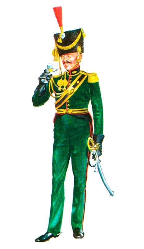 Мундир абсолютно идентичен форме рядовых по покрою и расцветке: темно-зеленый с черным прикладным цветом, но сукно вокруг лацбанта брюк обшито галунами в виде «пик» или золотых или черных с красной выпушкой.