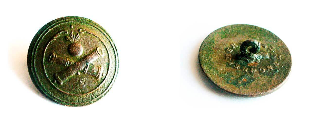 Мундирные пуговицы полукруглые, латунные, с рельефным рисунком кираса и каска на фоне трофейных знамен над орудийными стволами.