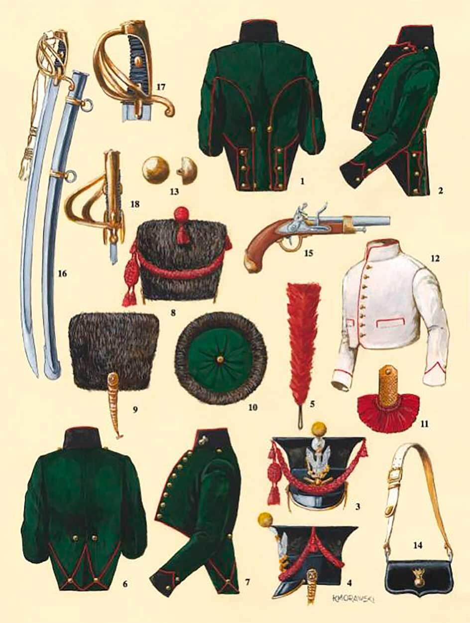 По поводу мундиров имеются сведения о зеленой куртке «польского» покроя с белыми воротником, лацканами (квадратными), обшлагами и отворотами фалд, зеленые панталоны и черные короткие гетры.