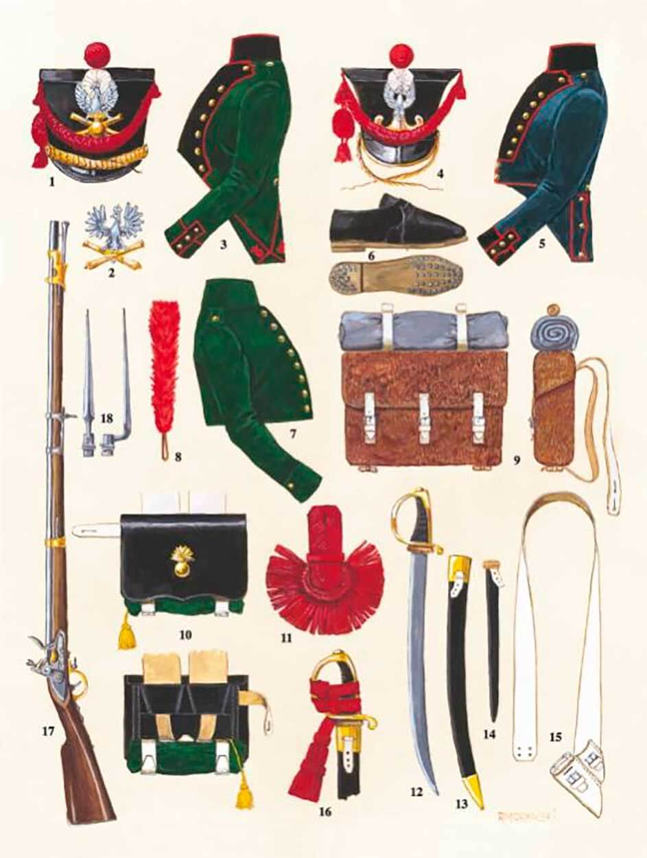 Кивер французского образца полагался в качестве головного убора: те же красные помпон, султан и этишкет, бляха в виде польского орла (по-видимому, сидящего на арматуре — неясно) и латунная чешуя подбородочного ремня.