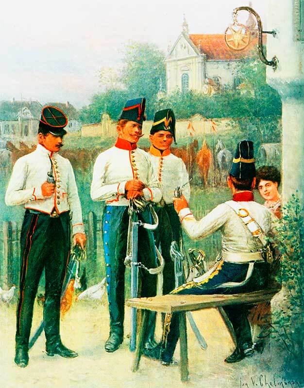 — красные гусарские чакчиры с желтыми «пиками» или венгерскими узлами на бедрах и галунами по внешнему шву;