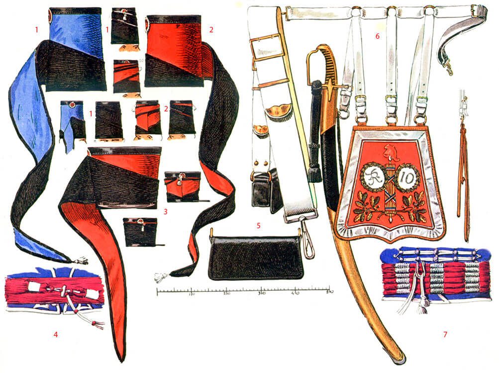 Так как буйволиная кожа, из которой изготавливалось все снаряжение, становилась редкостью, разрешено было заменять ее обычной кожей черного цвета. В 3-м гусарском кожаная амуниция имела именно этот цвет.