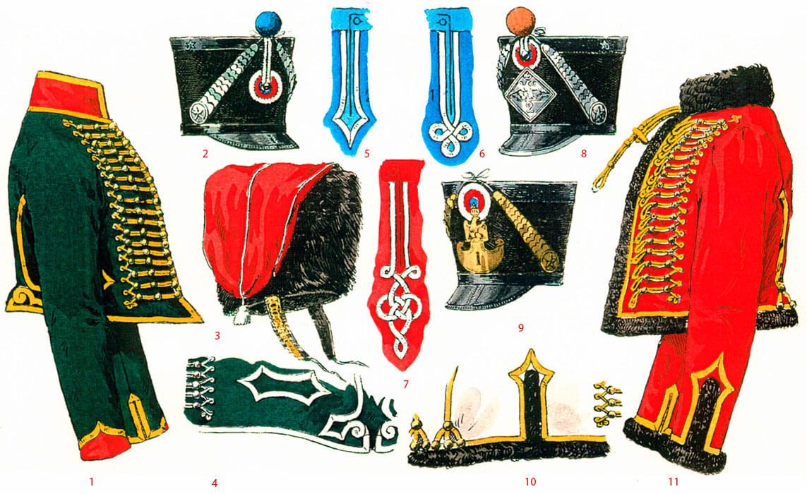 Помимо основной одежды, которая всегда более или менее соответствовала регламенту, в разных полках были различия в головных уборах, снаряжении и упряжи лошадей. Таким образом, мы имеем дело с большим разнообразием в одежде, обусловленным, с одной стороны, полковыми традициями и старыми привычками, а с другой — личными представлениями командиров корпусов, которые своими приказами и решениями навязывали подчиненным особенности в покрое одежды, расположении знаков различия, форме и орнаменте снаряжения и упряжи.