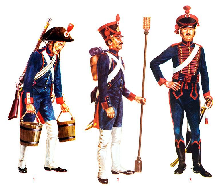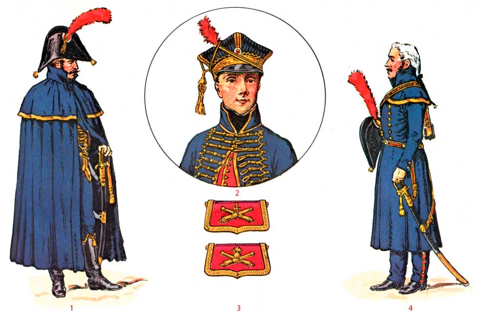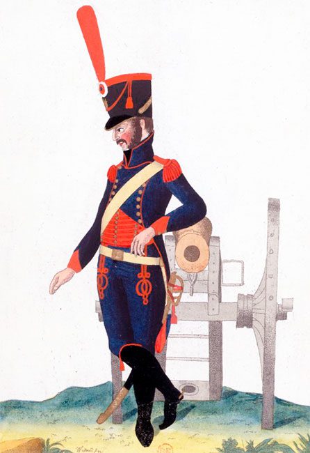 Конные артиллеристы носили темно-синюю униформу гусарского типа, а солдаты артиллерийского обоза, созданного в 1800 году, — серую (конно-егерского типа).