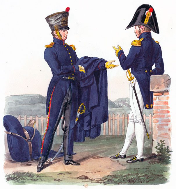 В 1810 году офицерам полагался кивер без шнуров, с латунной позолоченной бляхой в виде коронованного орла на полукруглом основании, со звездочками на розетках подбородочной чешуи, с верхней золотой тесьмой, ширина которой зависела от чина, как в пешей артиллерии: