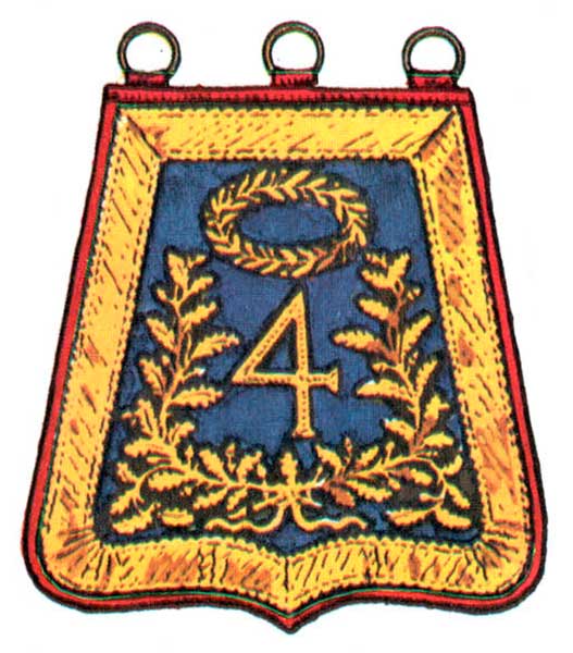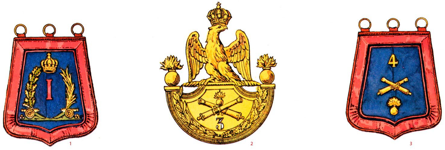 Коронованный орел на прямоугольном основании был менее распространен, чем другой образец — перекрещенные стволы орудий над номером полка, как, например, в 4-м полку.