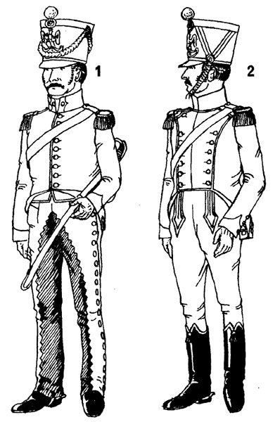 Позднее офицеры стали носить кивер с золотыми шнурами и тесьмой с позолоченной бляхой, подбородочной чешуей и петлицей, остались трехцветная кокарда и красные плюмажи (белые были у штаб-офицеров).