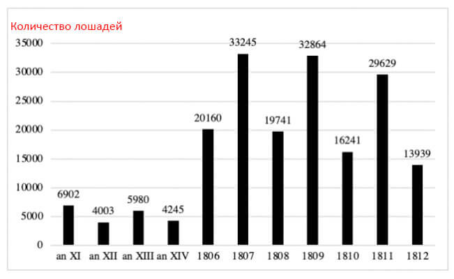Однако количество лошадей, взятых из национального табуна для нужд армий до 1812 года, оставалось крайне ограниченным. Объём лошадей, взятых для пополнения конюшен, оставался ниже пределов французских ресурсов (особенно с точки зрения количества родов) и составлял всего несколько тысяч лошадей в год, как показано на следующем графике: