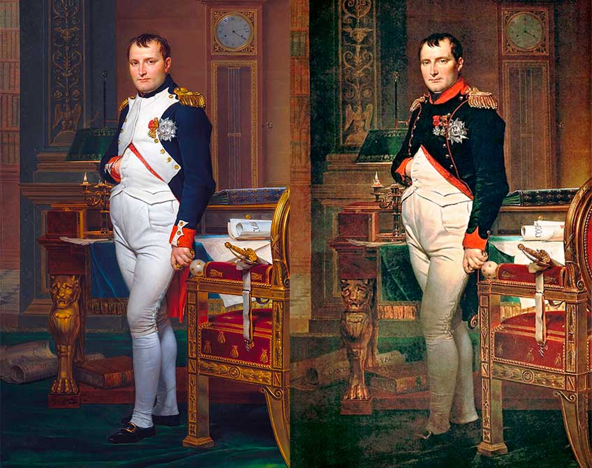 Первый вариант (слева): Наполеон в синей форме пехотинцев-гренадеров (Национальная галерея искусств/Фонд Сэмюэля Х. Кресса);