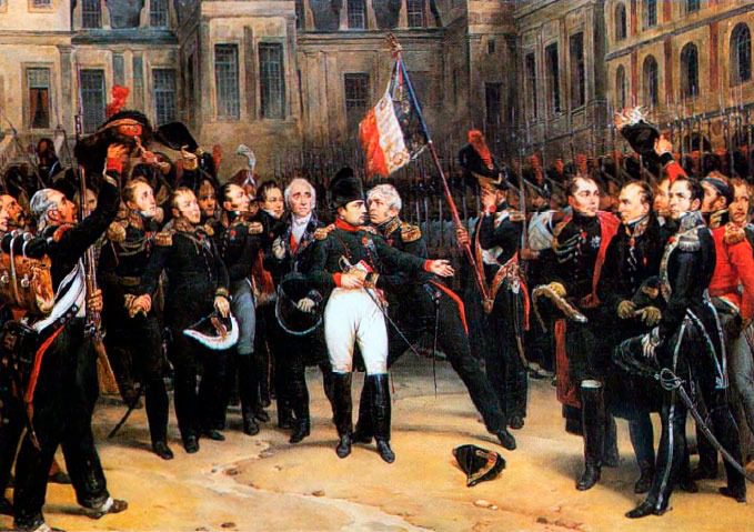 В левом верхнем углу видна знаменитая подковообразная лестница, созданная при Людовике XIII. Наполеон изображен в центре картины, лицом вперёд, в сапогах, с шпагой на боку, на голове – легендарная шляпа. За ним, слева, находятся представители стран-победительниц, держа шляпы в руках, с серьёзными лицами. Один из них приподнимает шляпу левой рукой. Два генерала Наполеона, также без головных уборов, стоят по бокам от него. Император держится очень прямо и не выказывает никакой слабости. На переднем плане слева солдаты размахивают шапками. Знаменосец, к которому Наполеон протягивает левую руку и который движется вперёд, прикрывает глаза левой рукой. Цвета преимущественно тёмные.