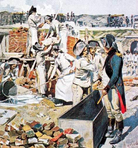 Строительство печи рабочими-воздухоплавателями: Статья 2 указа от 13 жерминаля II года предусматривала набор рабочих, специализирующихся на плотницком и каменном деле, для строительства печей.