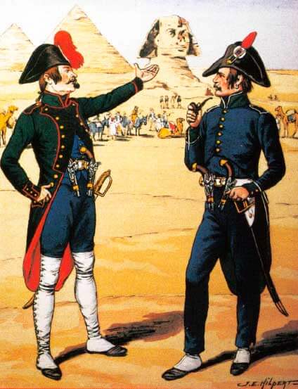 Длиннополый мундир, введенный в 1798 году, сшит с зеленым воротником, погонами и клапанами горизонтальных карманов, украшенными красными суконными выпушками; лацканы, обшлага и клапаны обшлагов — черные с красными выпушками, пуговицы — латунные. На походе жилет, кюлоты и гетры могли заменяться произвольными образцами, что было вызвано не только соображениями экономии, но и катастрофической нехваткой униформы и снаряжения в условиях блокады французской армии в Египте.